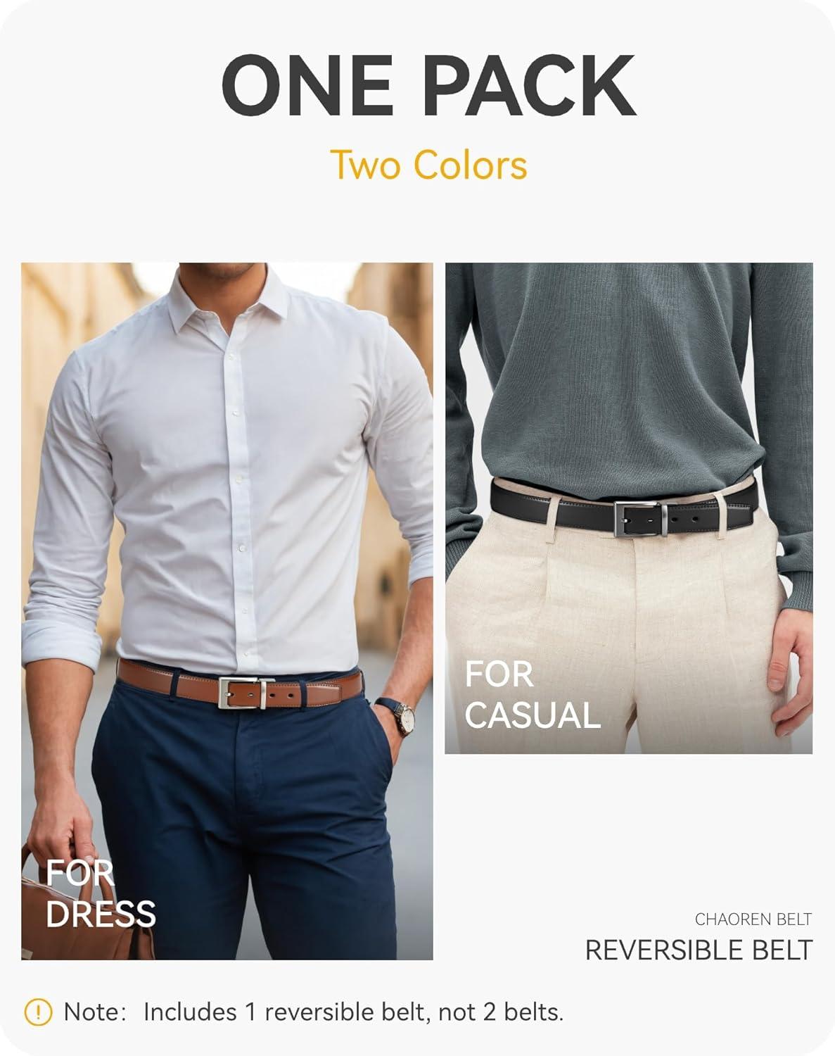CHAOREN Mens Belt 1 Piece – Leather Reversible Belt Men for Dress Pants – Single Belt, 2 Colors(Black/Orange Brown)