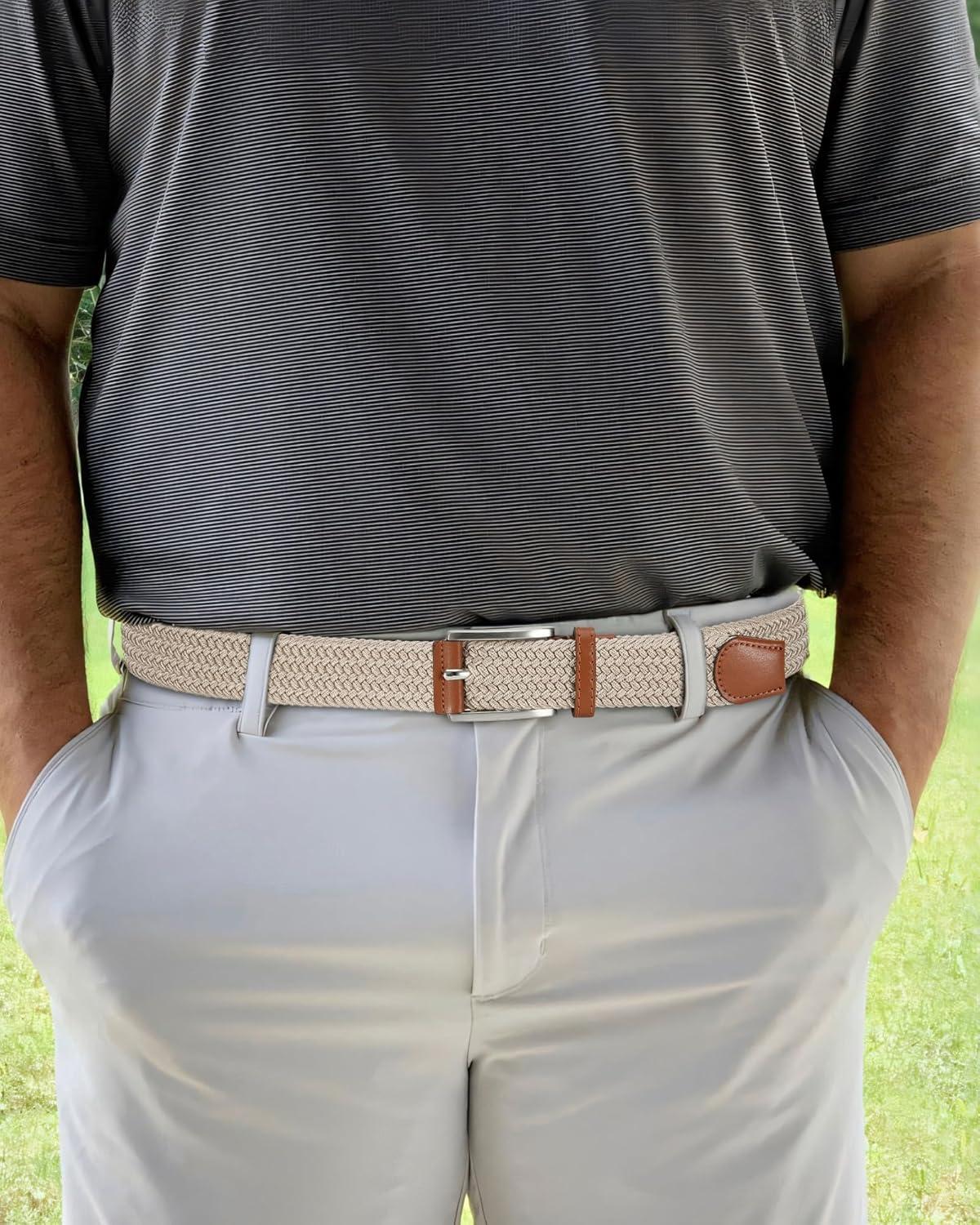 CHAOREN Mens Stretch Belt - 1 3/8" Elastic Braided Golf Belt for Men - Stretchy Web Fit Summer Casual Jeans(Silver / Beige)