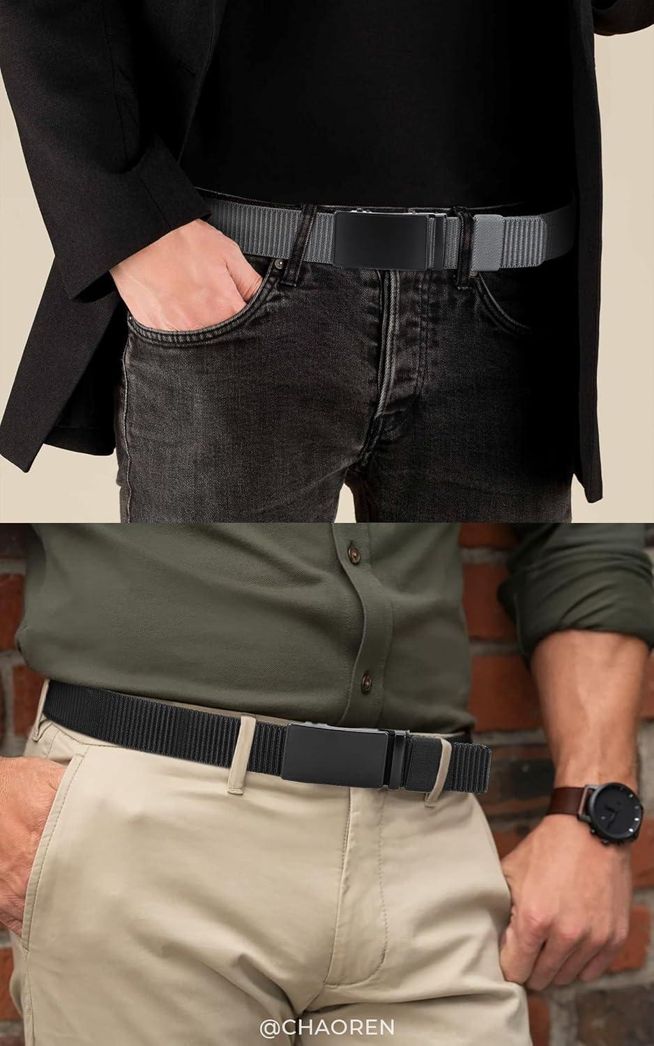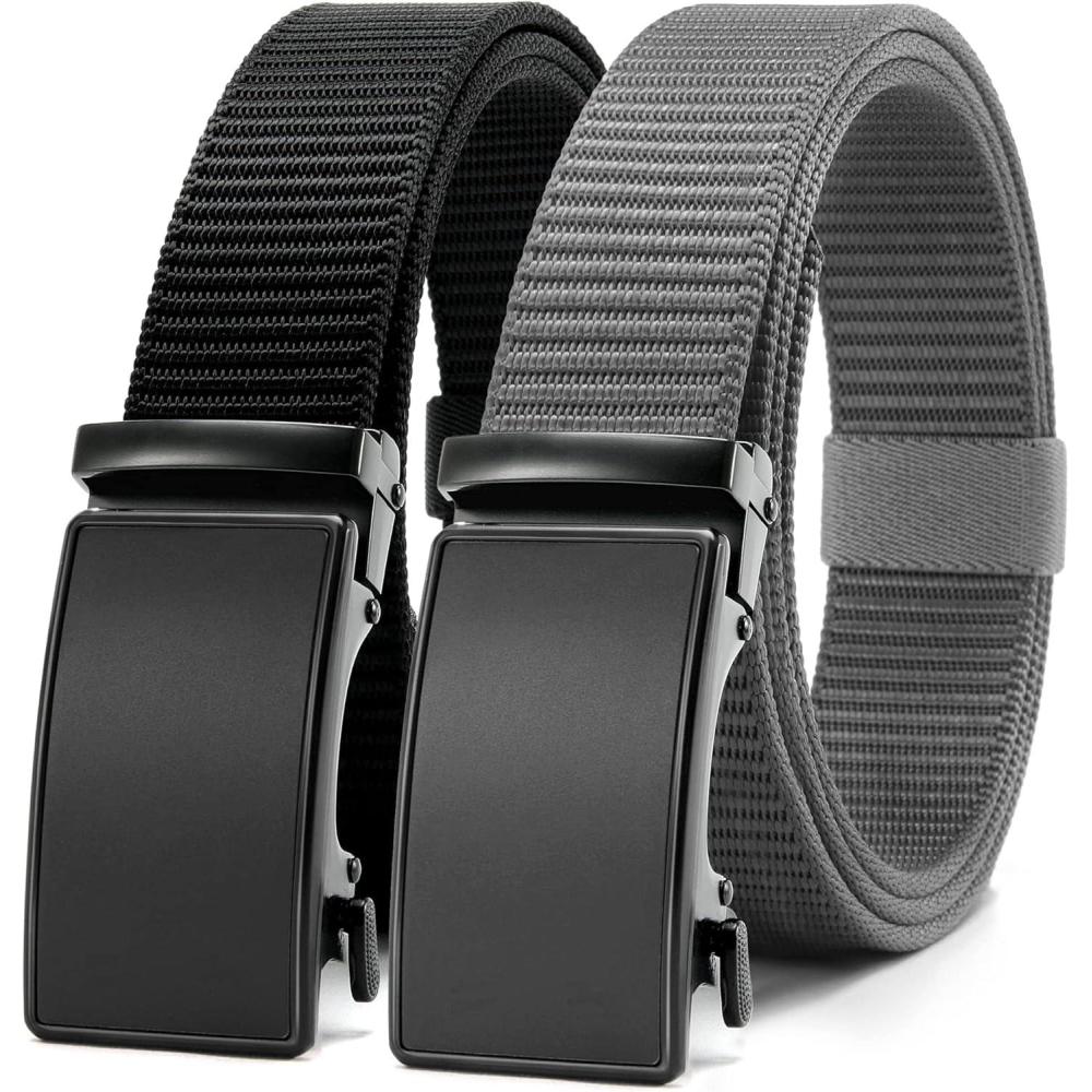 CHAOREN Ratchet Belts for Men 2 Pack – Casual Web Nylon Mens Belt 1 3/8″ – Automatic Adjustable Buckle Fit Jeans(Black and Grey/Ratchet Buckle)